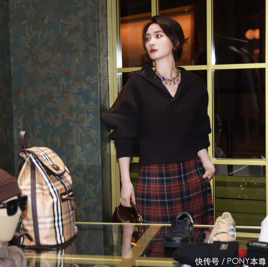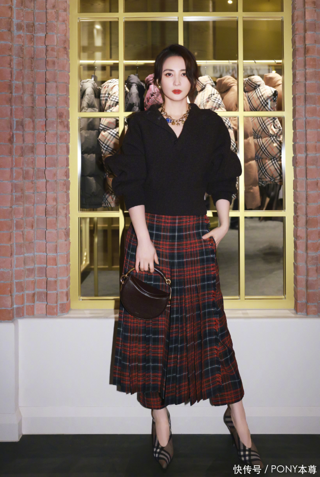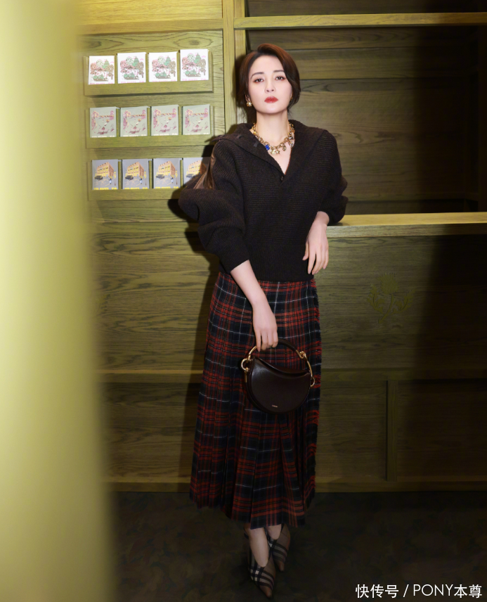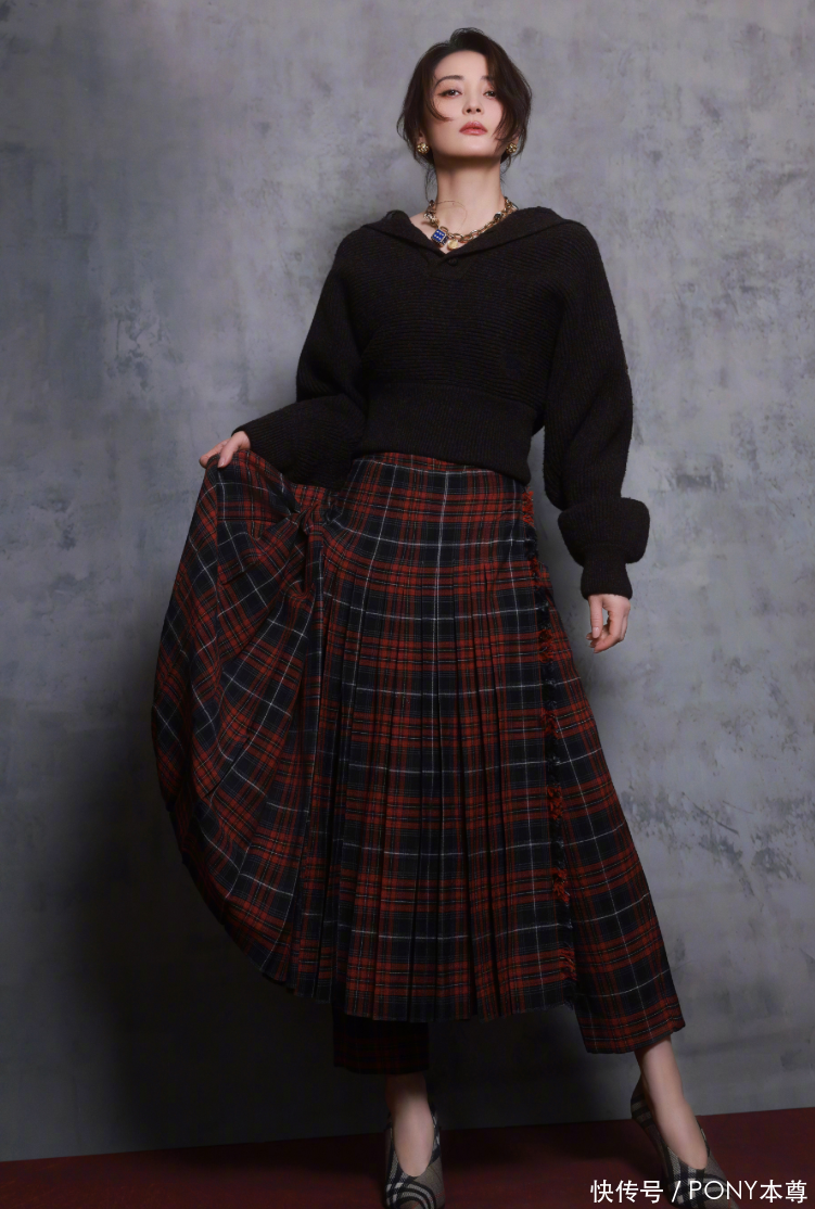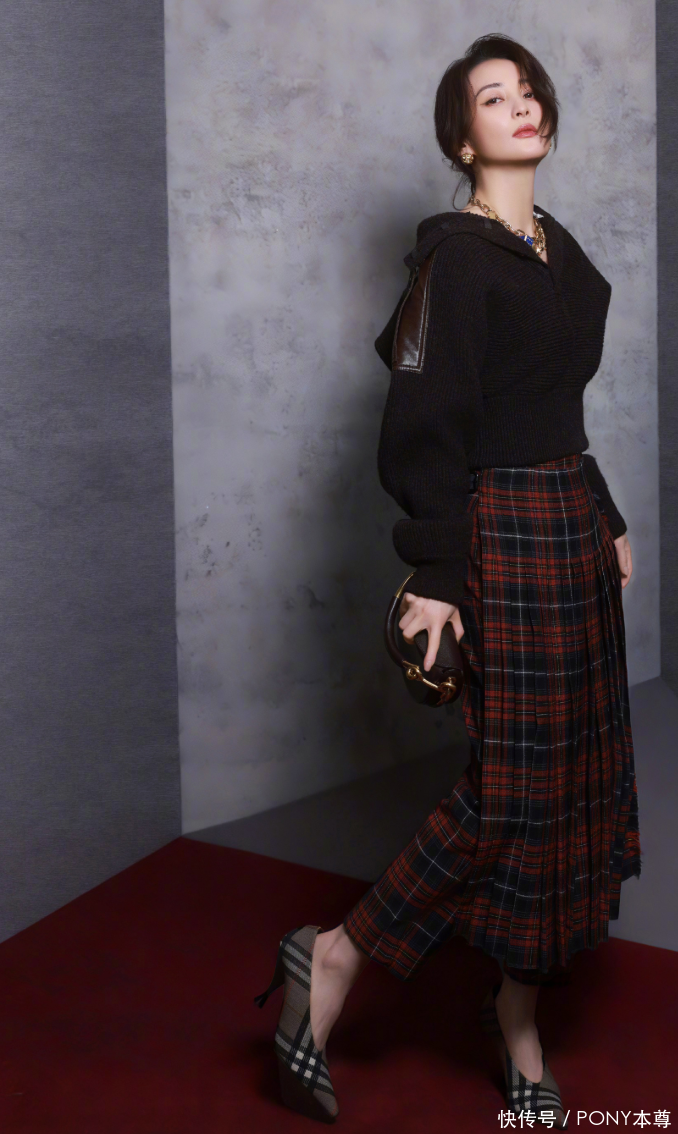蒋勤勤常以简约的穿搭和经典的色彩,展现出大气优雅的气质,如棕色翻领针织衫,搭配红色高腰半身裙,通过领口留白、袖口卷起等细节处理,营造出高级感。